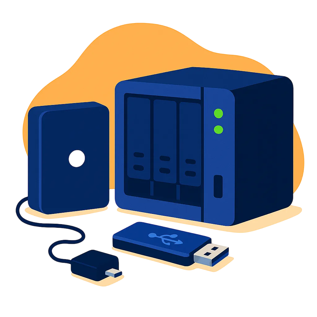 Solutions de stockage NAS, disques durs externes, SSD et clés USB. Marques : Western Digital, Seagate, QNAP, Kingston.